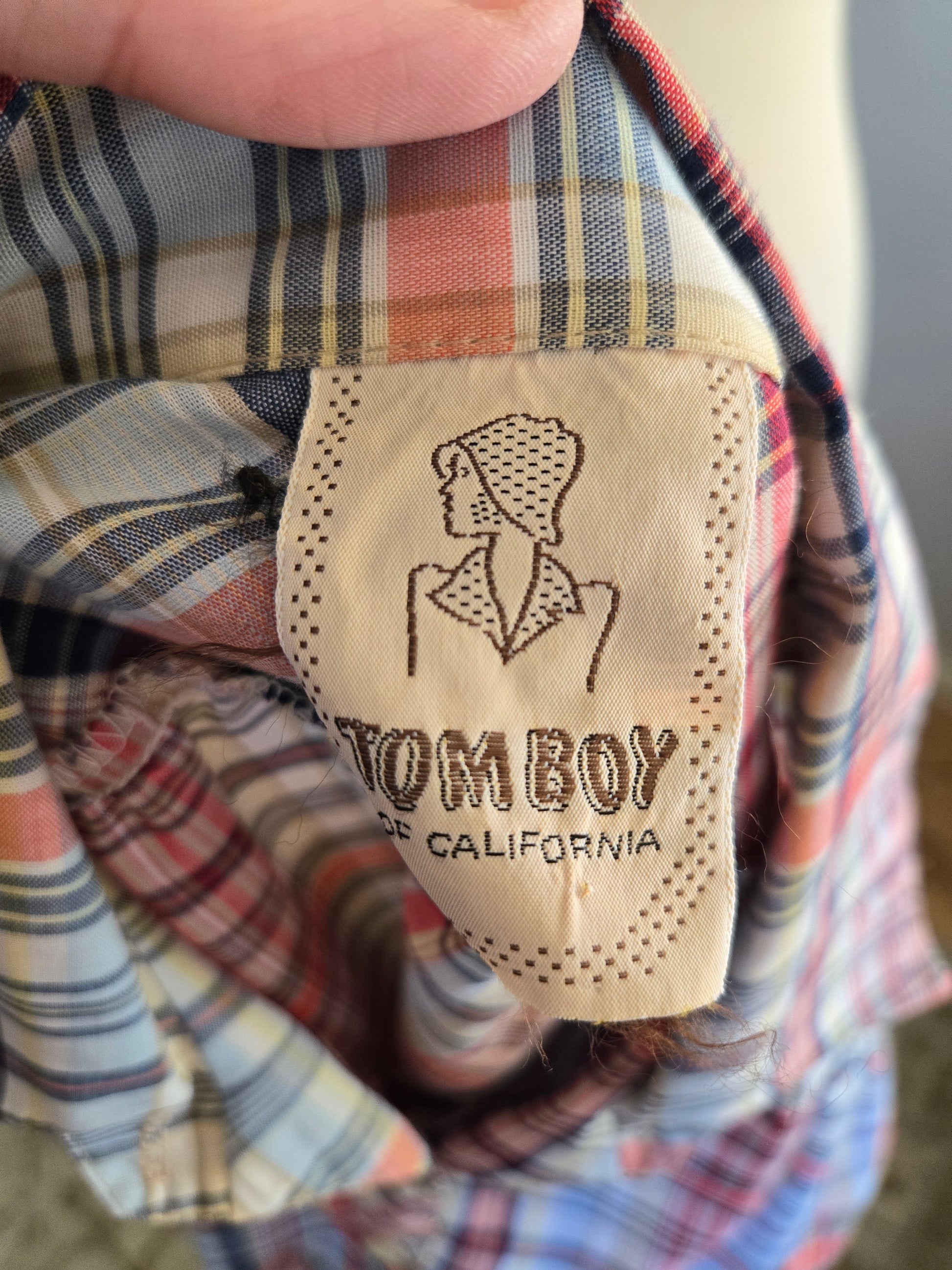 Here is a great short sleeve blouse from the 70s/80s by Tomboy of California. Feels like mostly or all polyester. Lovely plaid in red, blues, white, and tan. Six button front with a button on each arm. Thin, light weight, sheer, soft, and comfy. It's in amazing condition with tons of life left! Here are the measurements when laying flat.
