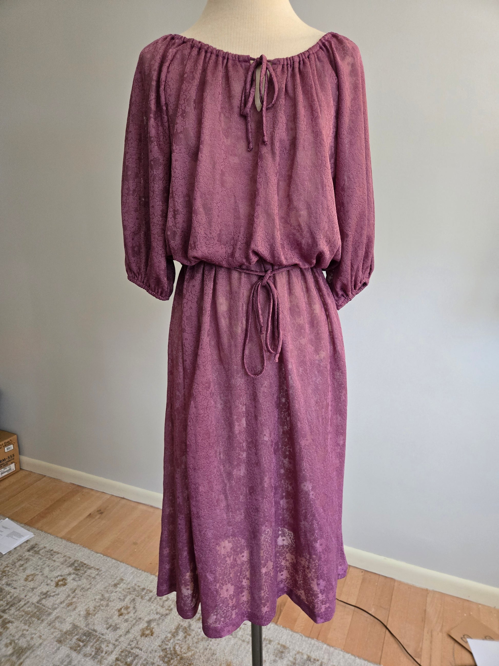 Here is a lovely short sleeve dress from the 70s. Feels like mostly or all polyester. Wonderful purple color with delicate lacy floral design throughout. Low cut shoulder line. Drawstring tie at the collar above a keyhole opening, with matching removable cloth belt. Very light weight, sheer, thin, soft and comfy. It's in excellent condition with years of life left! Here are the exact measurements taken laying flat (be sure to reference the last photo to see how I measure dresses).