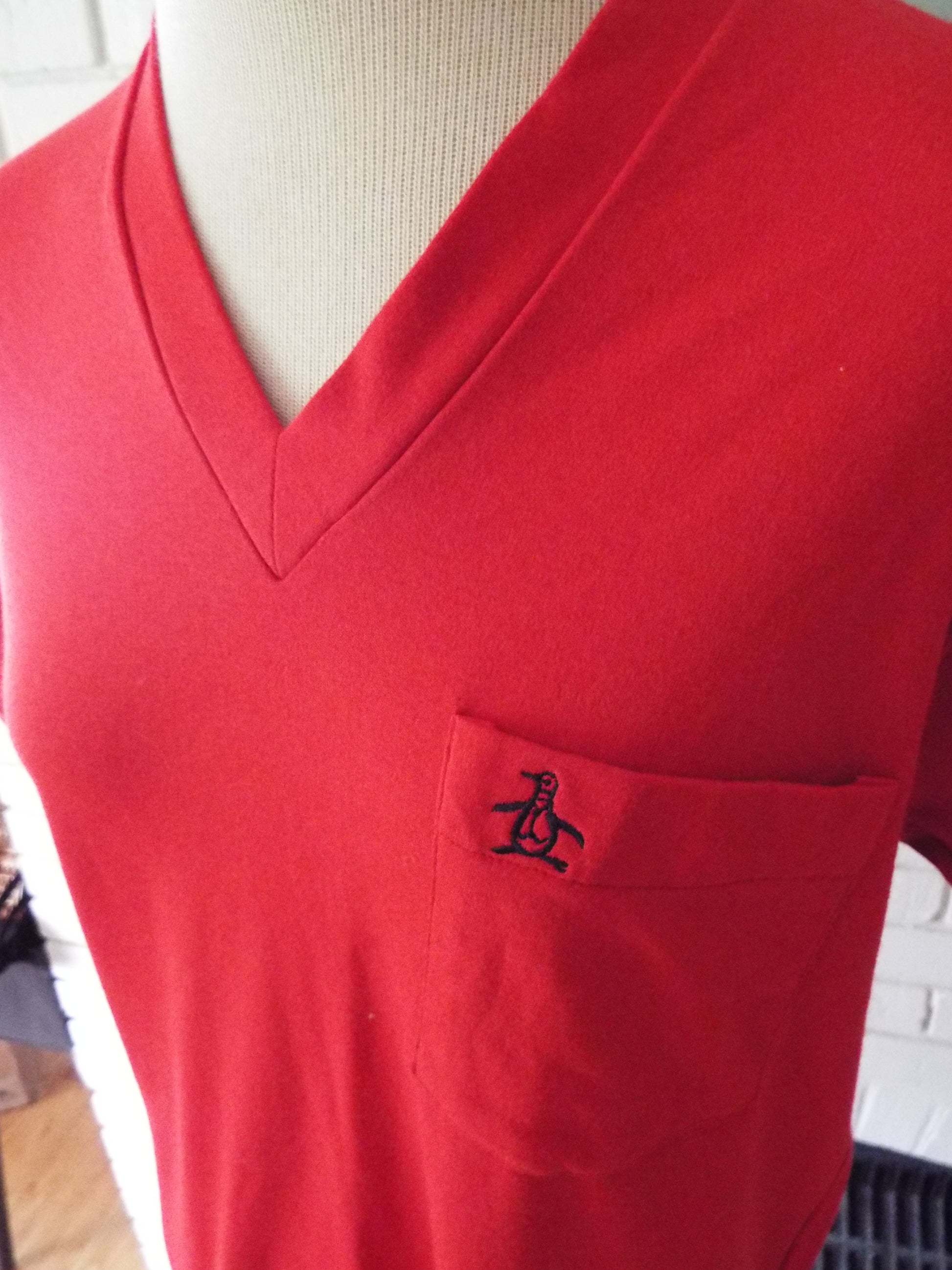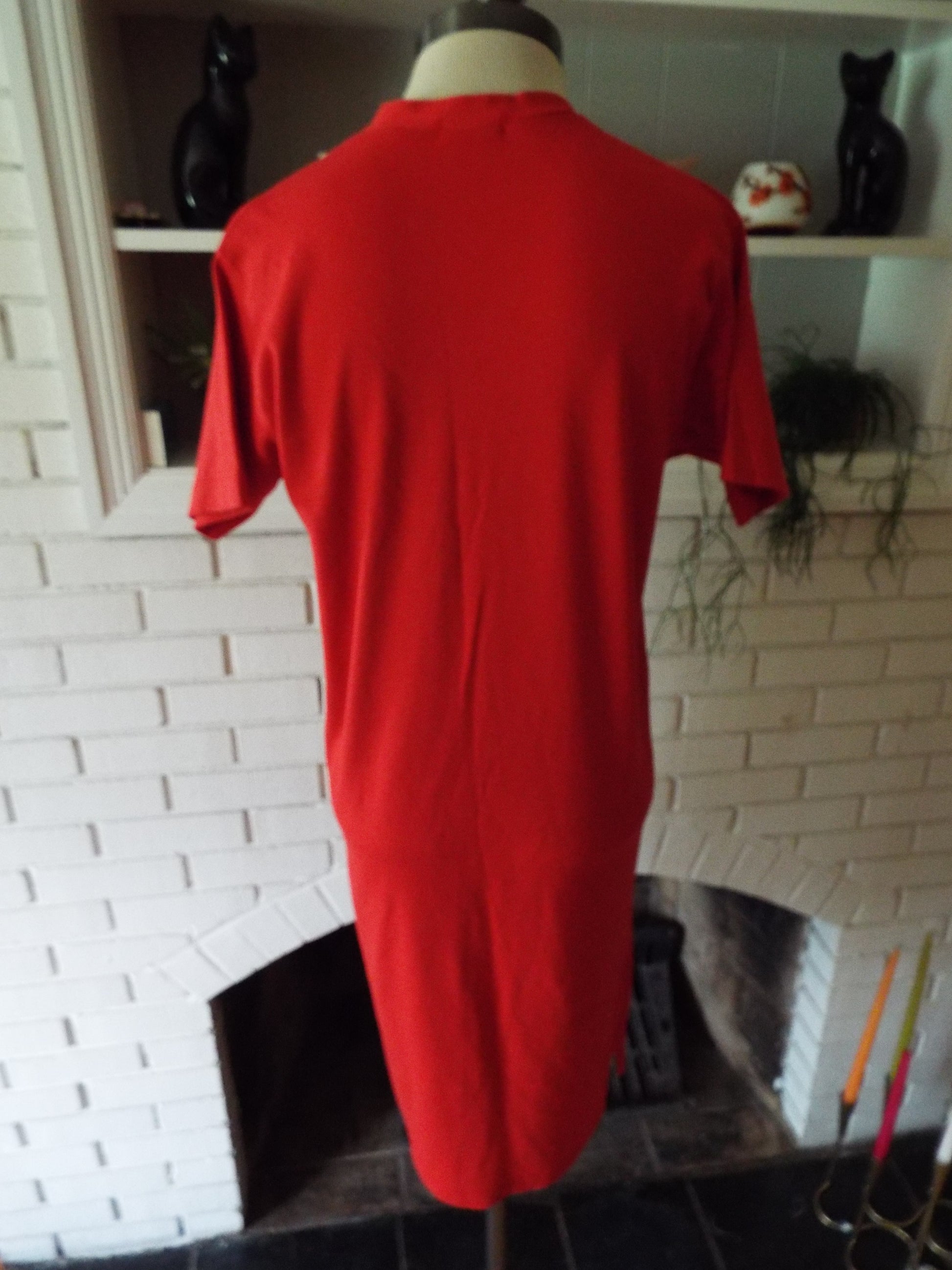 Here is a wonderful short sleeve dress by Munsingwear. 100% combed cotton. Rich red fabric with V neck and pocket on the left breast. Trademark penguin embroidered on the pocket in very dark blue. Six inch slit at the bottom of each side. Medium weight, soft, and comfy. It's in amazing shape with lots of life left! The tag says Medium, but here are the exact measurements taken laying flat. (be sure to reference the last photo to see how I measure dresses)