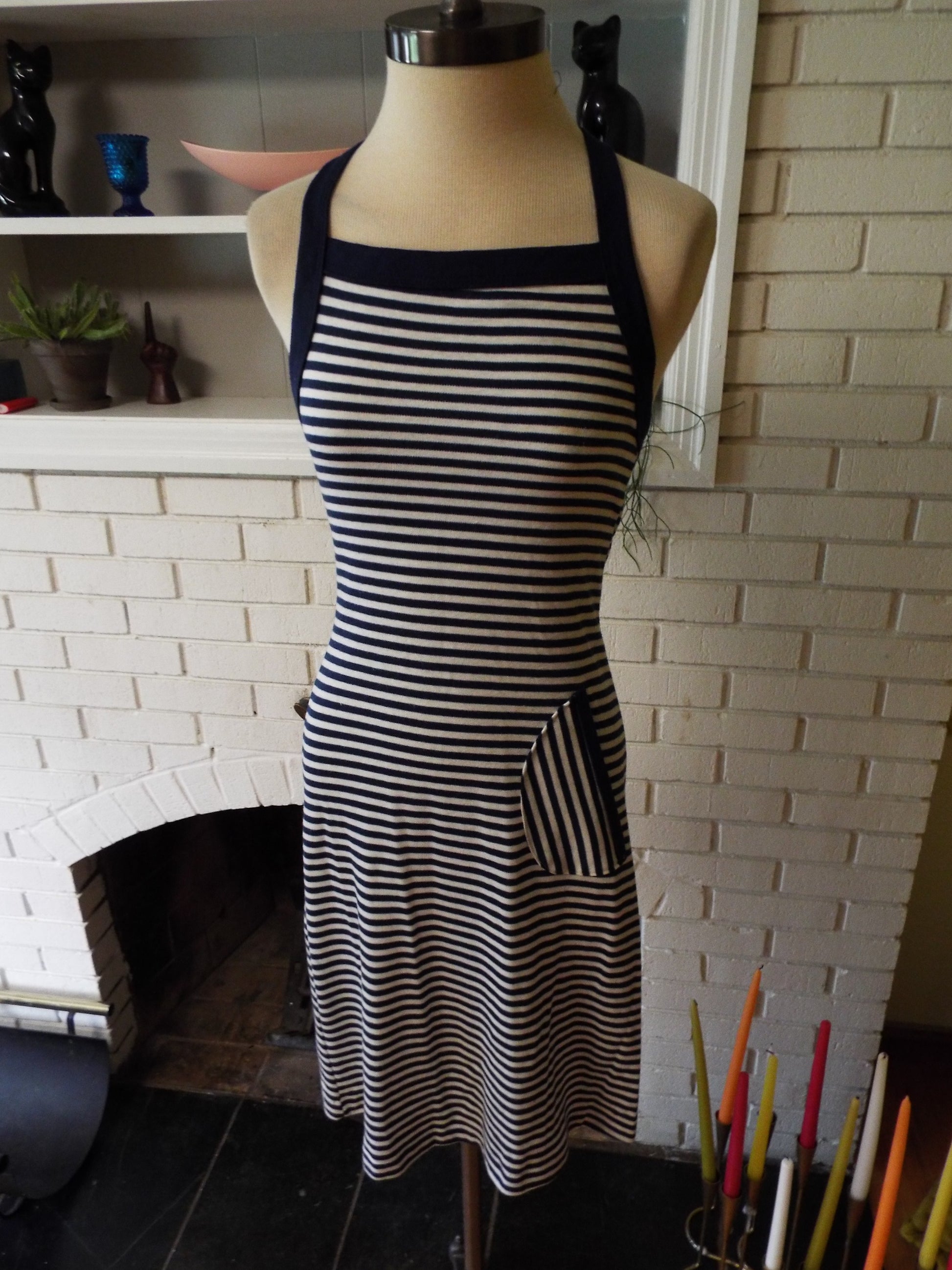 Here is a gorgeous sleeveless dress by Wrangler. Feels like maybe a cotton blend, and made in the USA. Dark blue and white striping throughout. Sweet little plastic ring detail at the back of the straps. Pocket on the left hip. It's sheer, thin, soft, and super comfy. It's in amazing condition with years of life left! The tag says Small, but here are the measurements when laying flat: