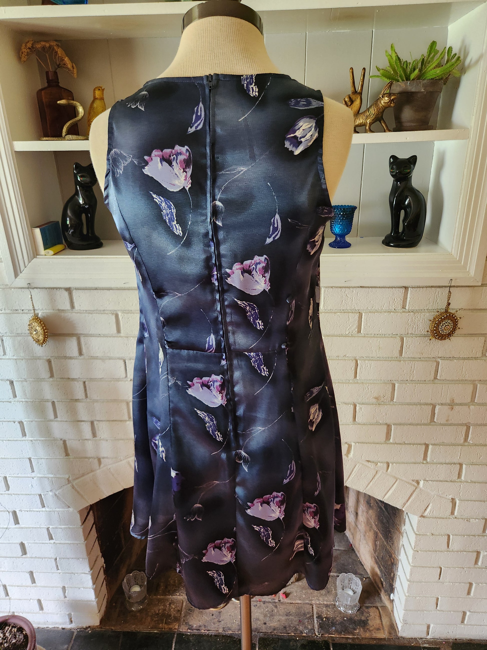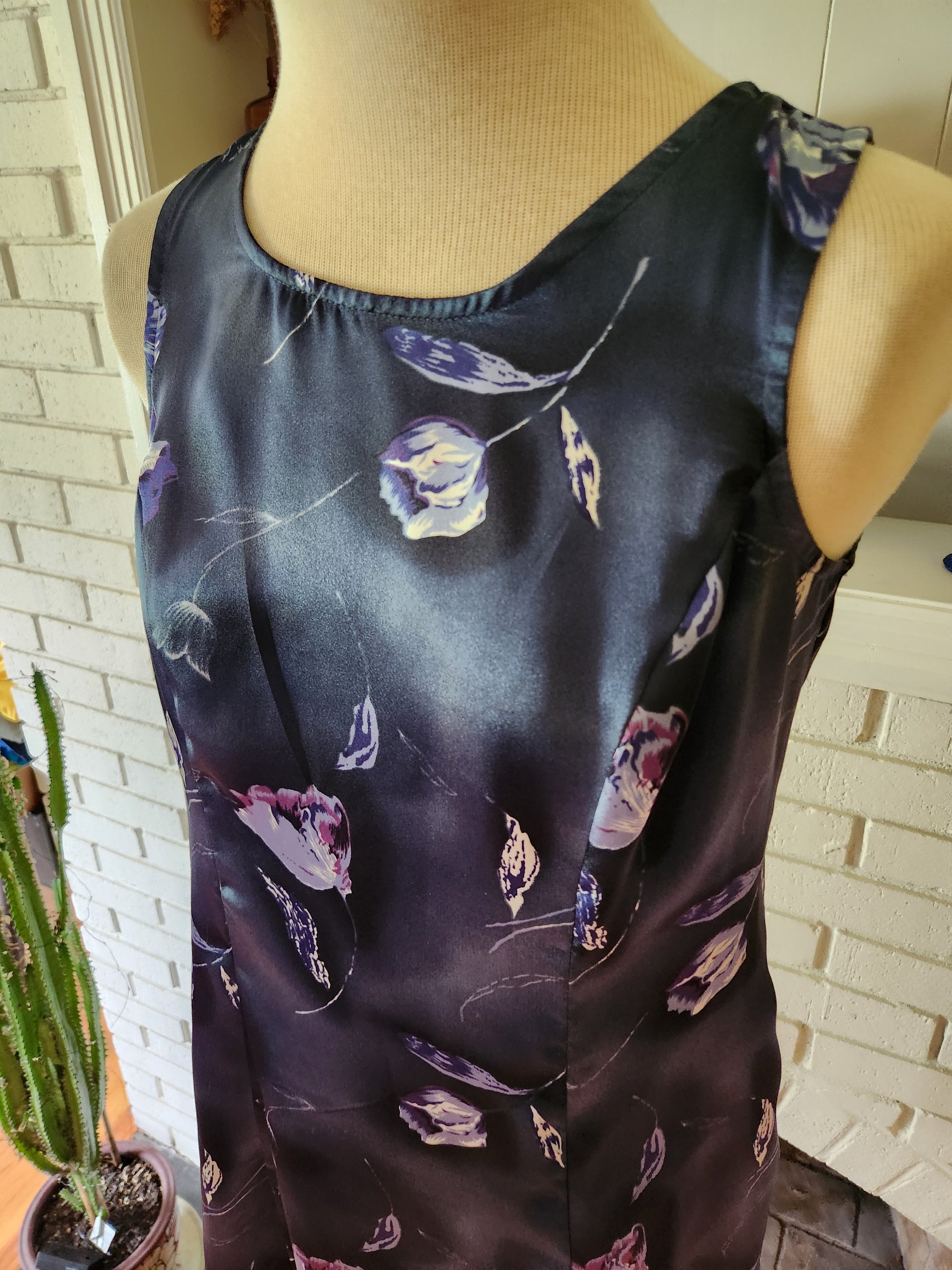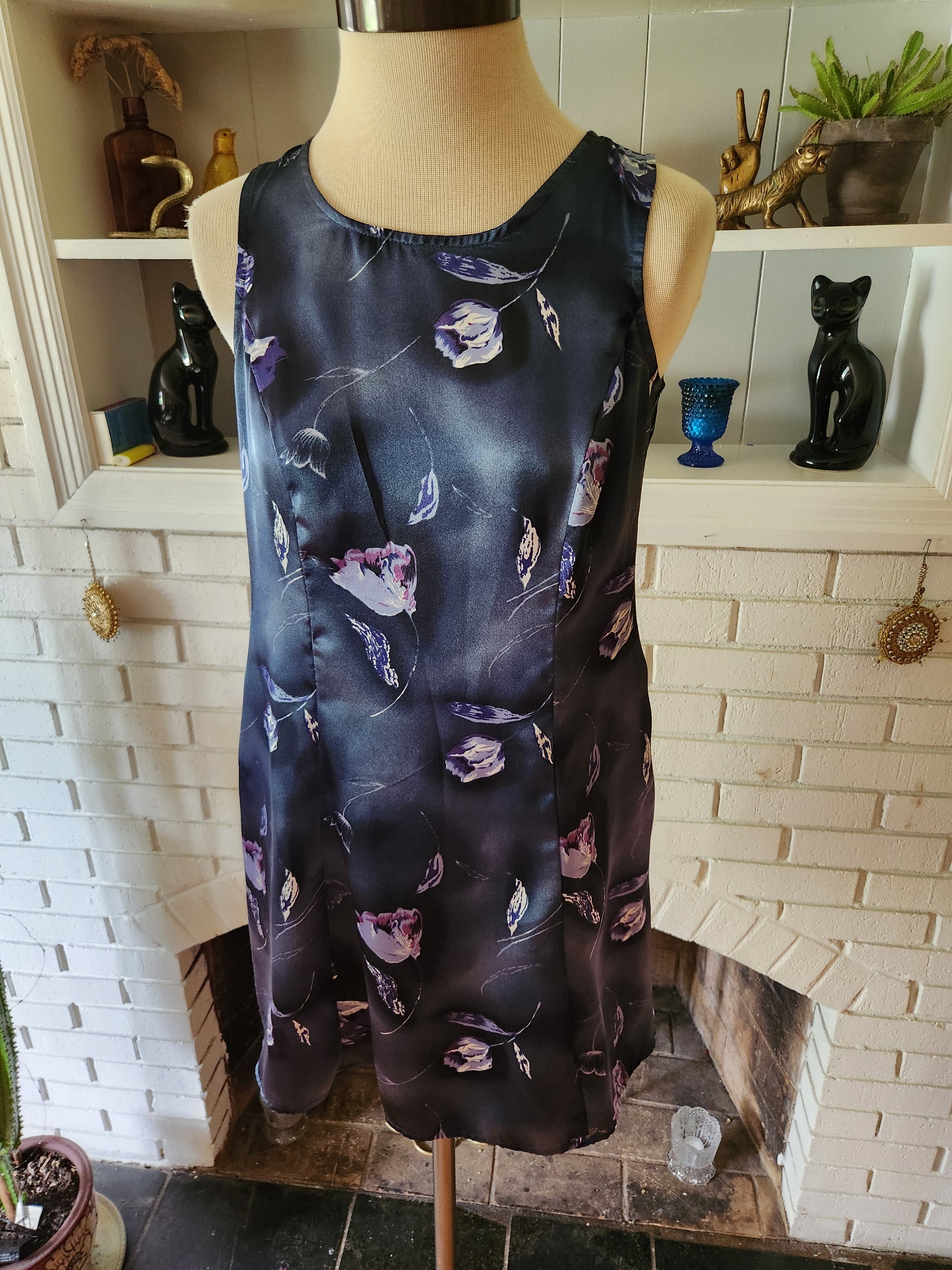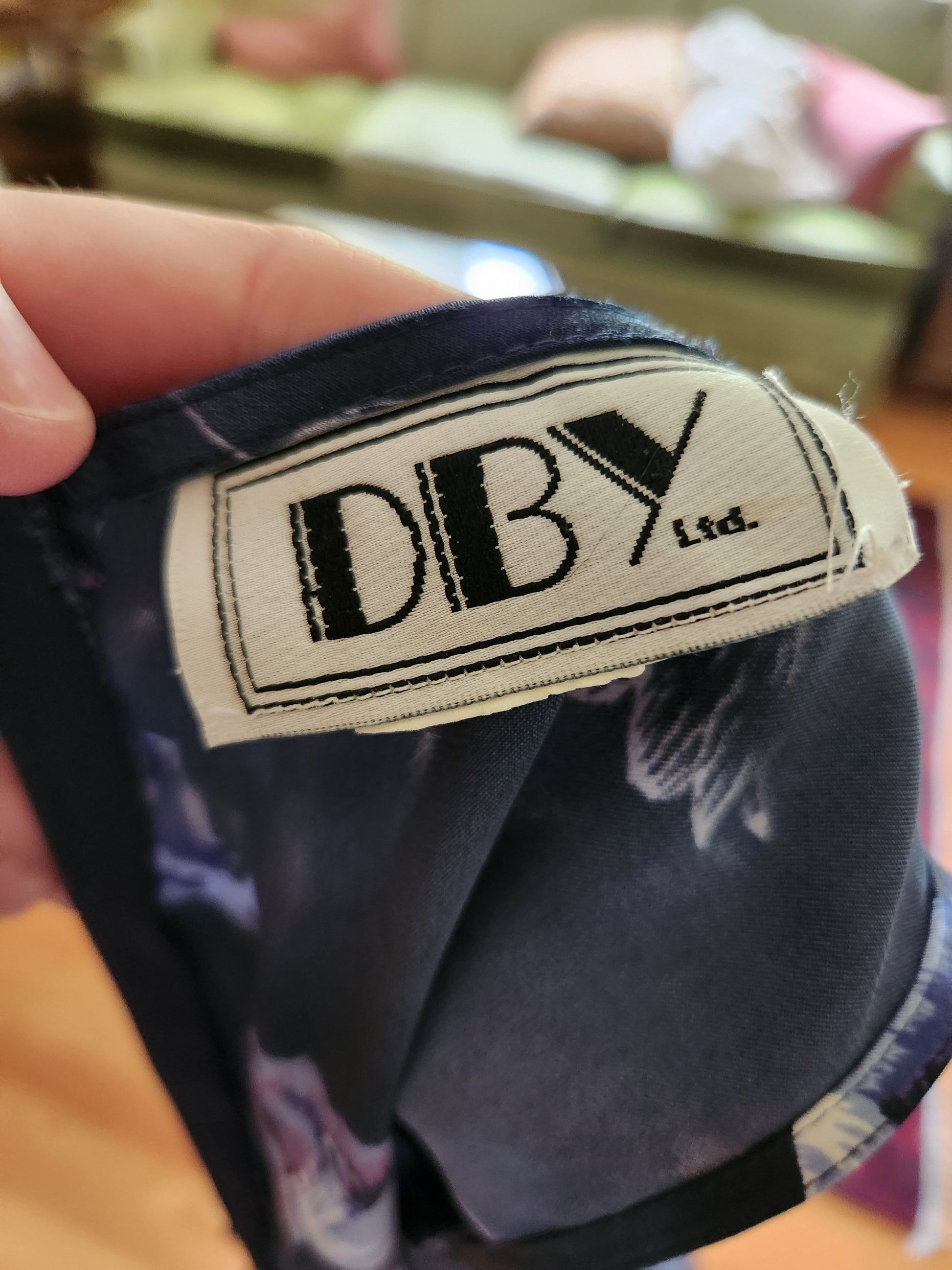This is a perfect sleeveless dress from the 90s by DBY. Feels like mostly or all polyester. Gorgeous floral graphic on silvery blue background. Straight line shape with no frills. Twenty inch zipper down the back, with four eyelets if you want to add something to cinch it a bit Thin, light weight, sheer, soft, and comfy. It's in amazing condition with years of life left. Here are the exact measurements taken laying flat. (be sure to reference the last photo to see how I measure dresses)