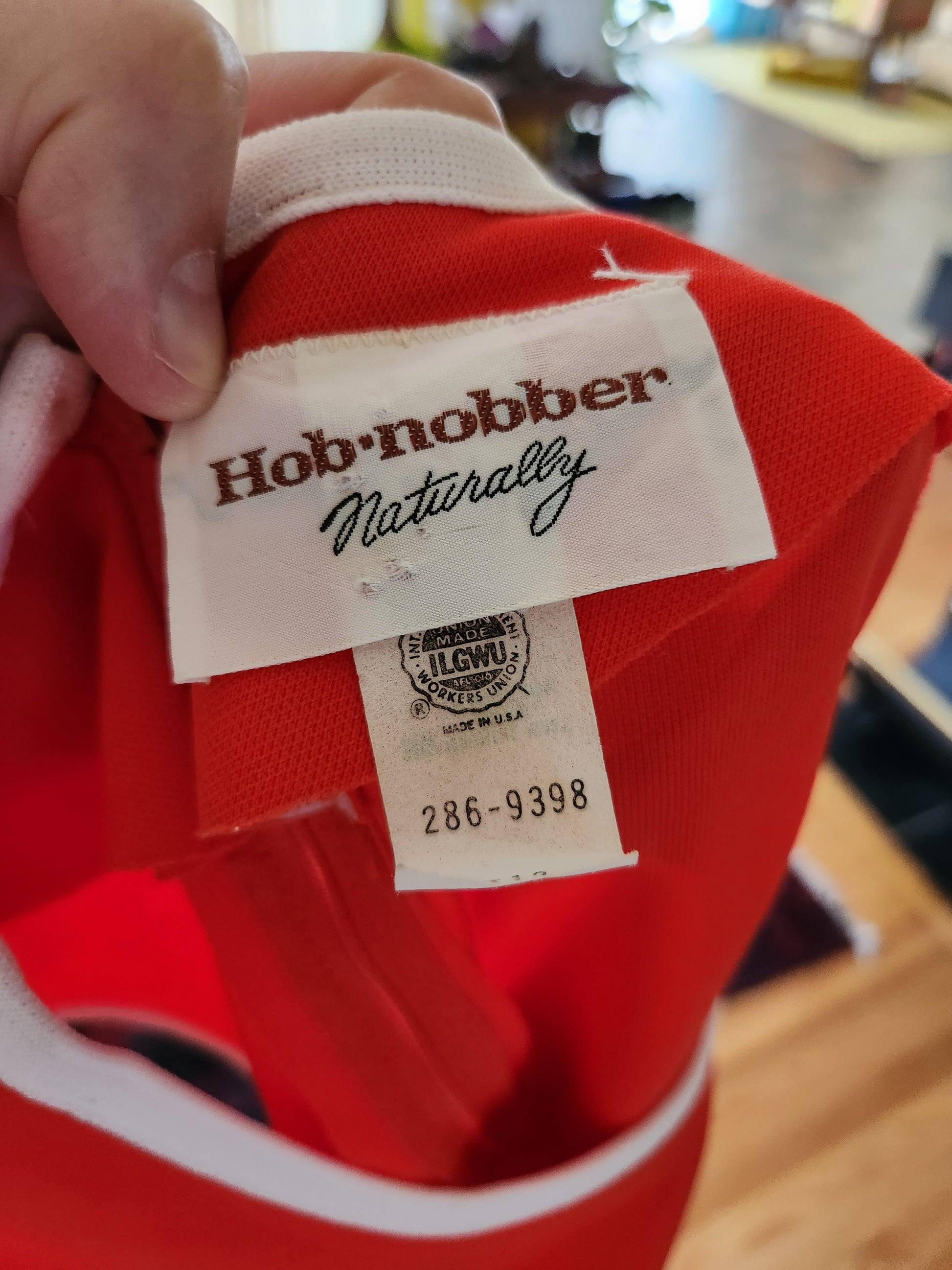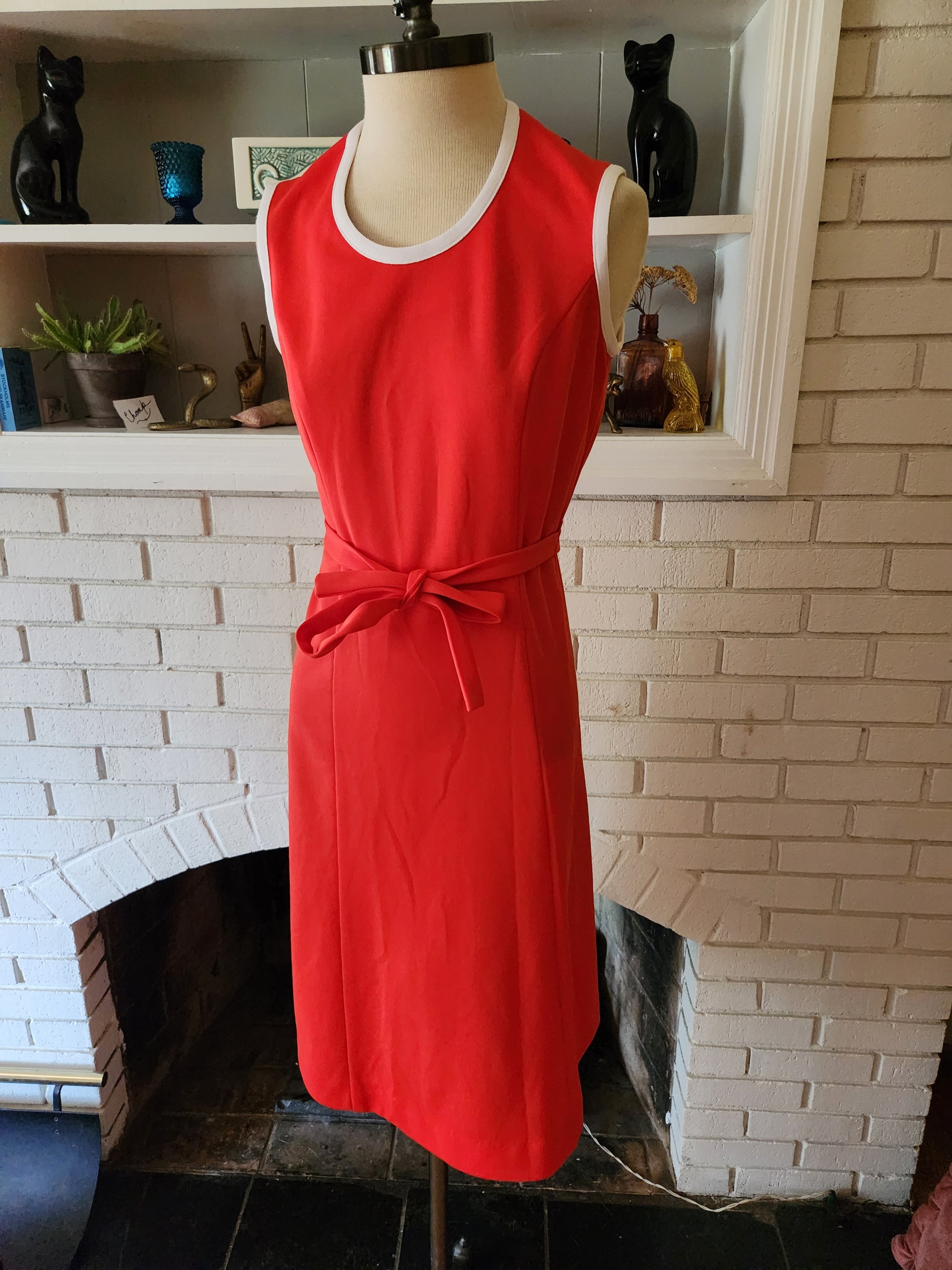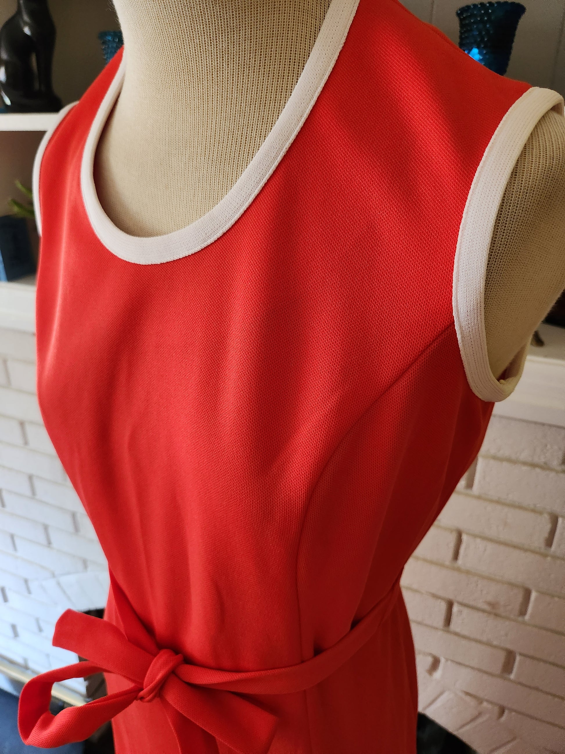 Here is a beautiful sleeveless dress by Hob Nobber. It's 100% polyester and made in the USA. Gorgeous orange red fabric with white accents. Matching cloth belt and 22" zipper down the back. It's in amazing condition with years of life left! The tag says size 12, but here are the exact measurements taken laying flat. (be sure to reference the last photo to see how I measure dresses)