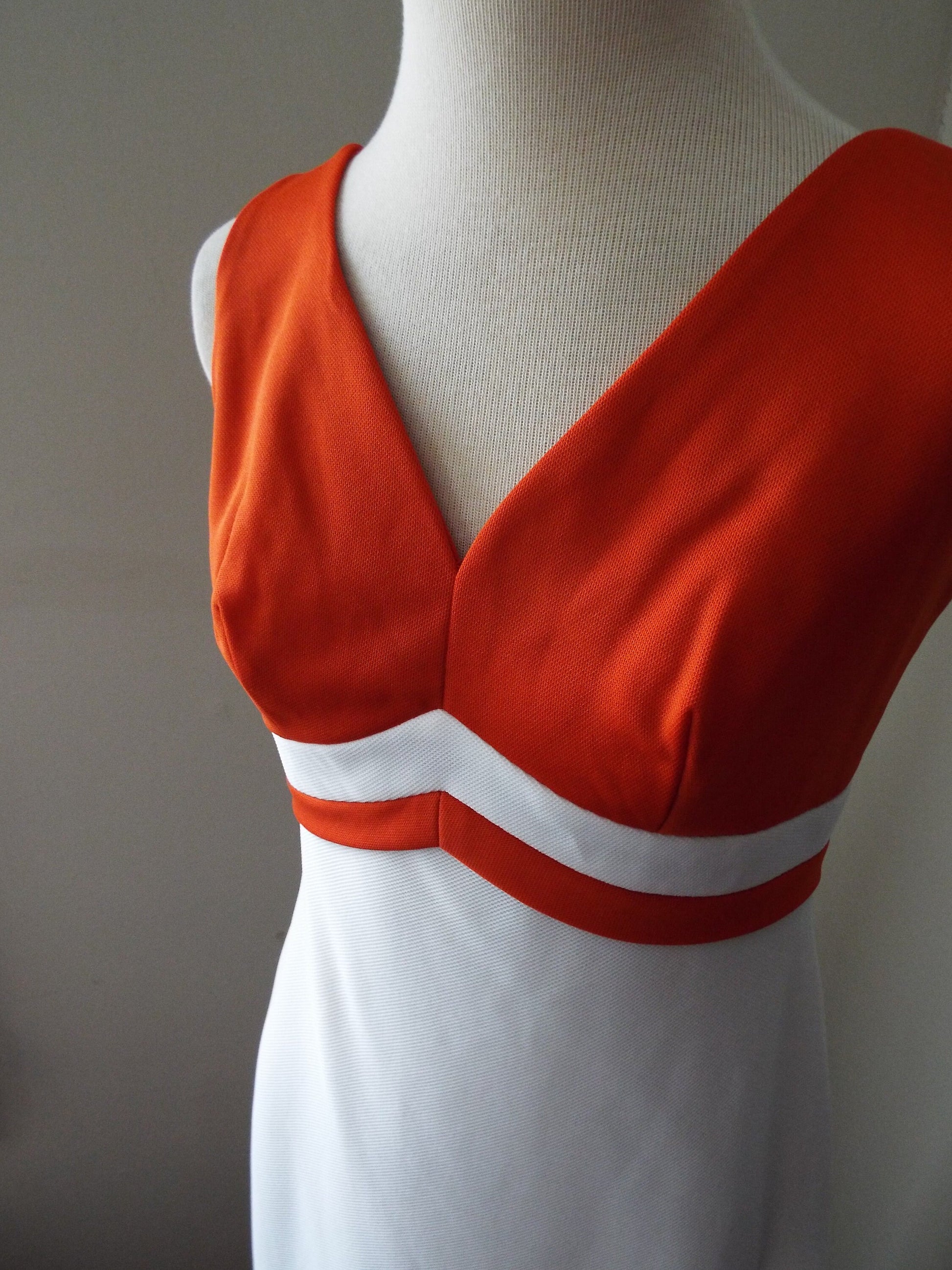 This is a stunning sleeveless dress by Mel Warshaw. Feels like mostly or all polyester. White dress with blood orange blouse section and accents, featuring a lovely stitched floral section at the bottom. Fifteen inch zipper down the back. Medium weight but fairly sheer. This is a high quality dress and it's in amazing shape with lots of life left! The tag says size 10, but here are the exact measurements. (be sure to reference the last photo to see how I measure dresses)
