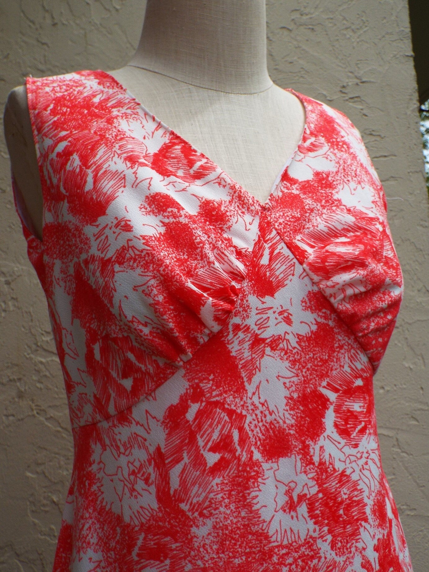 This is a gorgeous sleeveless dress. It is a white fabric with a bold yet subdued floral design in red. Great shape to it. Zippered back, built in slip. 100% polyester. A wonderful Spring/Summer dress. In amazing shape with tons of life left! Here are the exact measurements. (be sure to reference the last photo to see how I measure dresses)