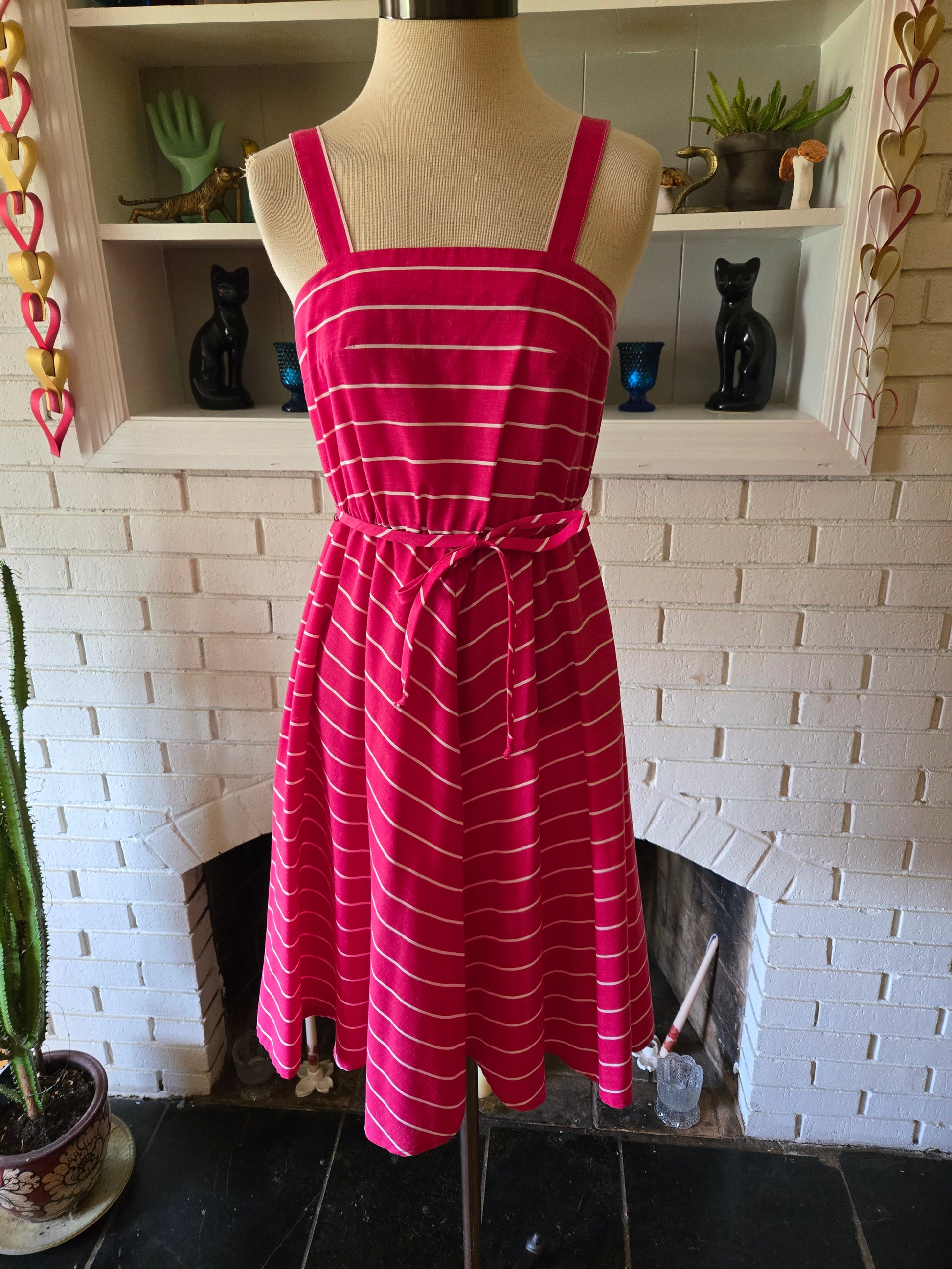 This is a wonderful short sleeve dress from the 70s/80s by Malouf. 50/50 blend of polyester and cotton. Pink with white striped fabric throughout. Detachable matching cloth belt. It's fairly light weight, sheer, soft and comfy. It's in amazing condition with years of life left! The tag says Size 5/6, but here are the exact measurements taken laying flat (be sure to reference the last photo to see how I measure dresses)