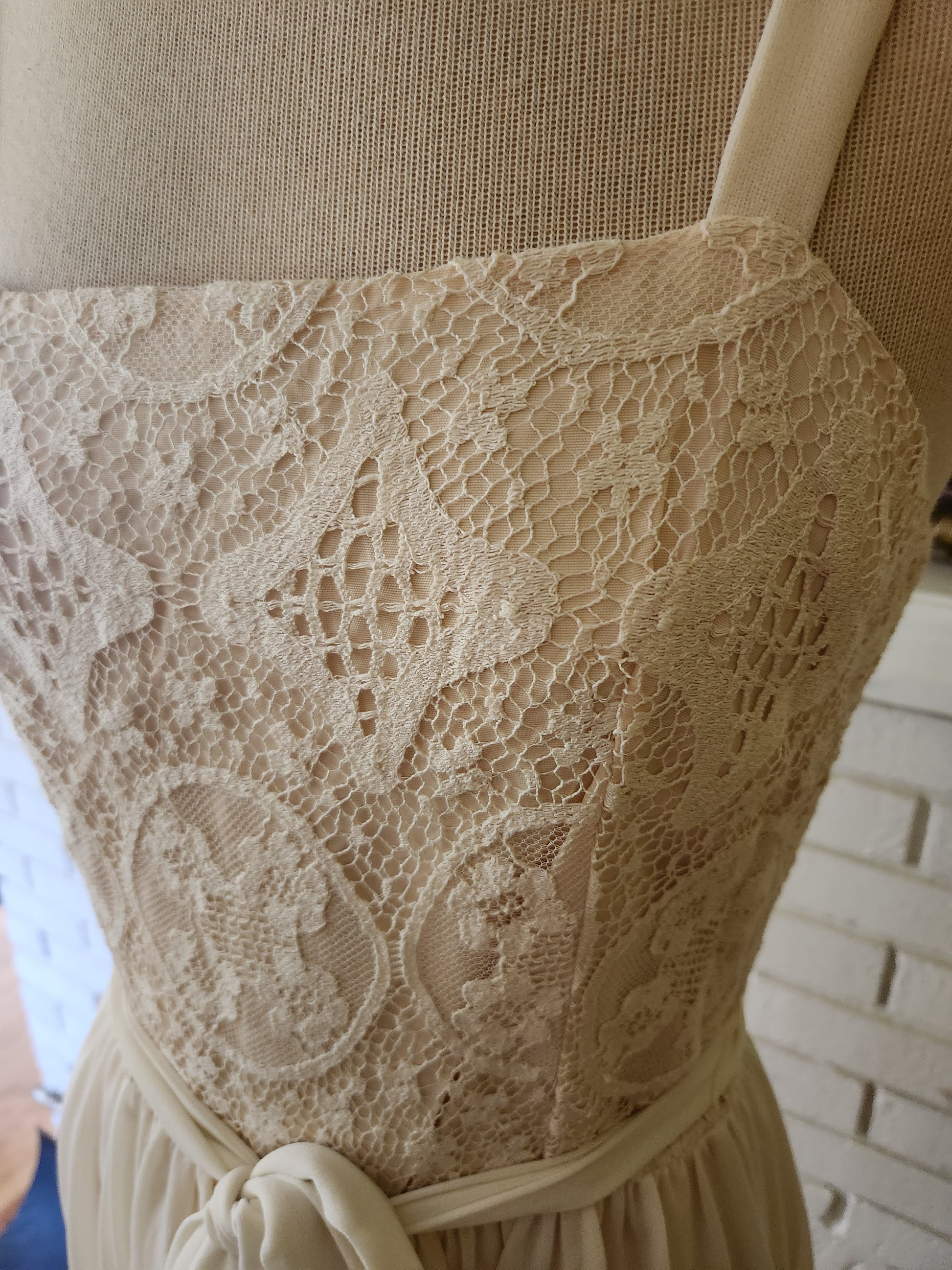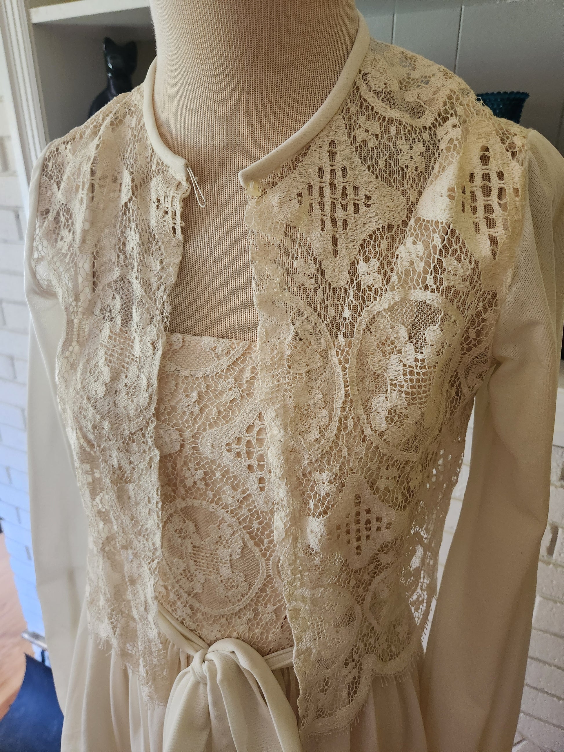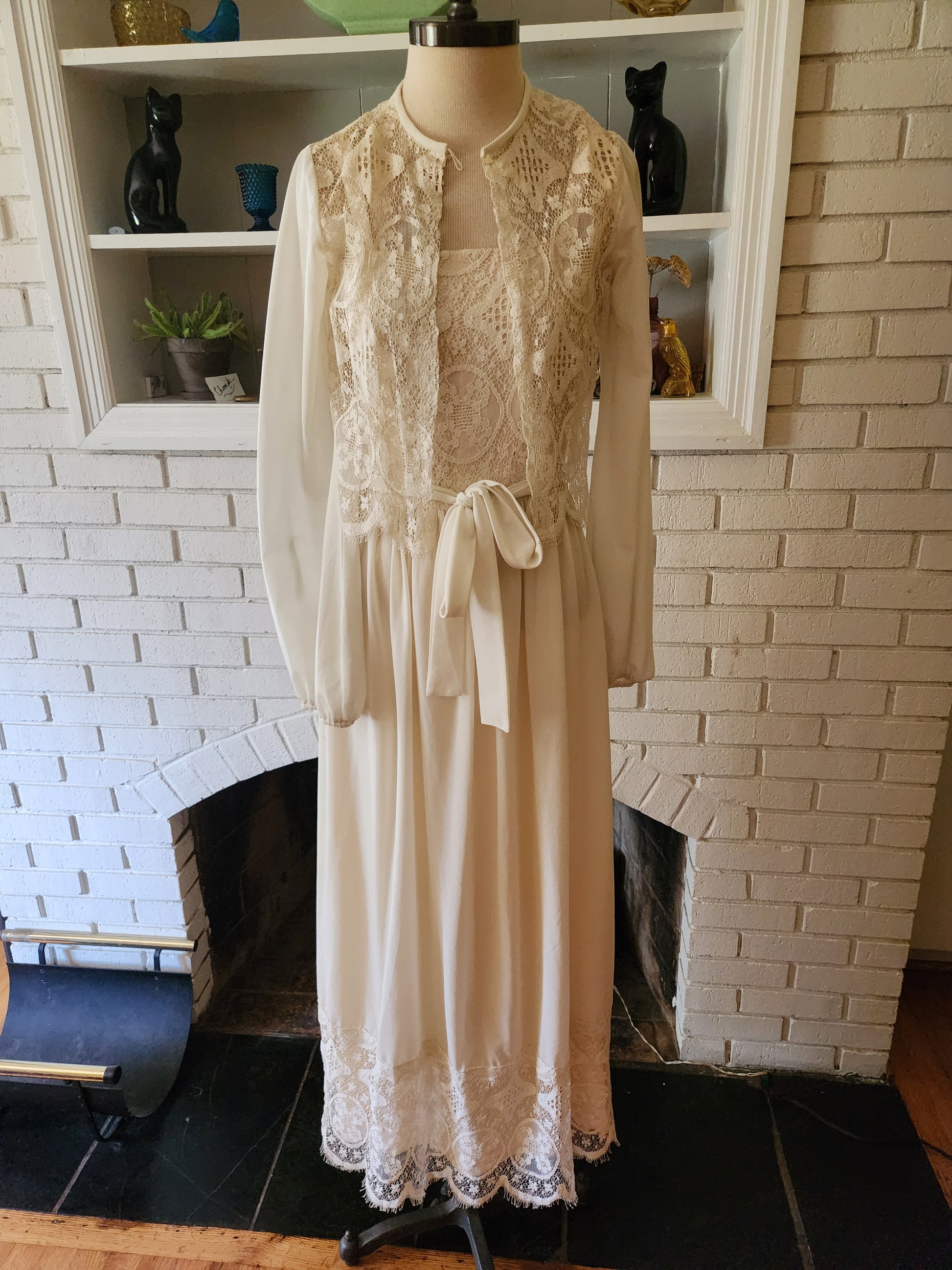 Here is a gorgeous sleeveless dress by Sears. Polyester and acetate. I'm not sure if calling this a wedding dress is totally accurate, cause you can wear whatever you want whenever you want. But it looks like it could be, so I guess I'll stick with it. Creamy off white fabric with ecru underlayment beneath the lace in the top section. Sixteen inch zipper down the back, and a matching removable cloth belt. Built in slip. Delicately beautiful long sleeve wrap has a one button closure at the front. Absolutely stunning, and in excellent condition with tons of life left. The tag says size 12, but here are the exact measurements. (be sure to reference the last photo to see how I measure dresses) Here are the measurements: