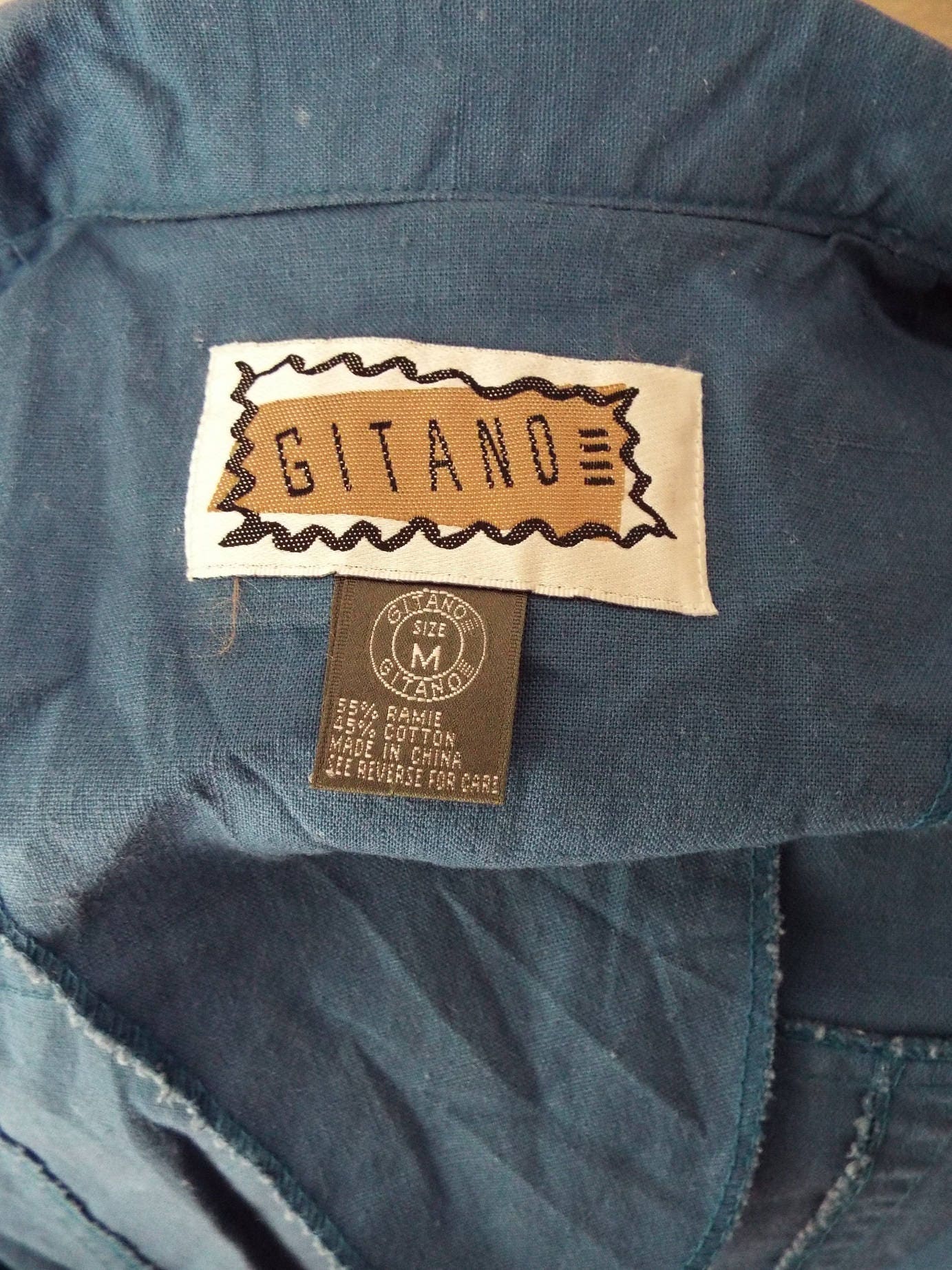 Here is a lovely sleeveless wrap dress by Gitano. If you were a child of the 80's, you had some Gitano! This one is 55% Ramie, 45% cotton. It has sort of a light canvasy feel to it. Wonderful blue fabric with lots of nice details. Epaulet on each shoulder, pocket on the left breast, buttoned pocket on each hip, five hidden buttons down the front of the skirt section, three silver buttons at the back of the skirt section. It has a two hidden snap method of closing at the waist, and has belt loops for future accessorizing. There is elastic at the back of the waist, so there will be a bit of give in this area. Not a ton though, because the snaps are not moveable. This is an exceptional multi season dress, and it's in amazing shape with tons of life left! The tag says medium, but here are the exact measurements. (be sure to reference the last photo to see how I measure dresses)