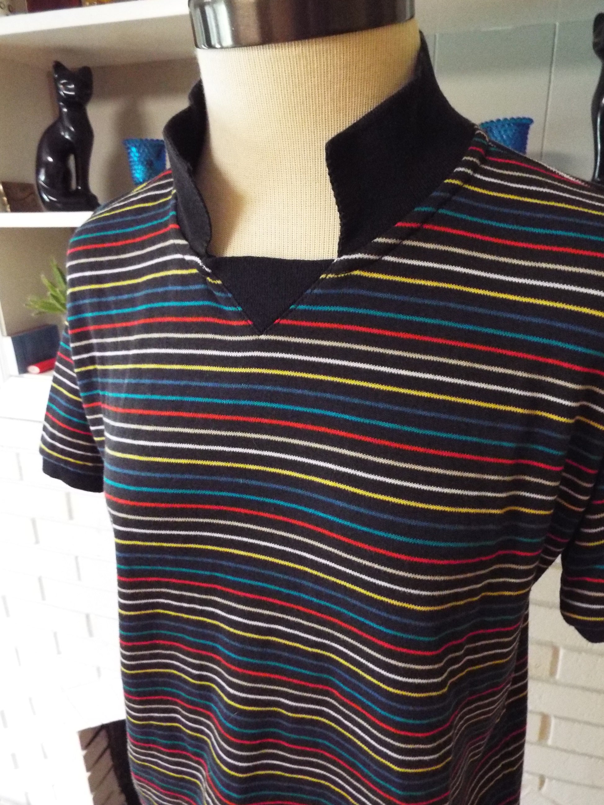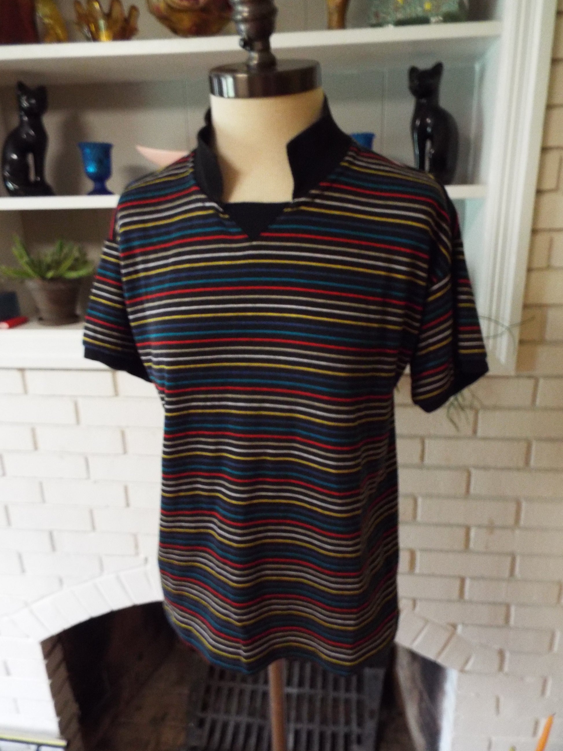Here is a great vintage shirt by Jantzen. Feels like an acrylic or cotton blend, and made in the USA. Black shirt with horizontal striping of yellow, blue, green, tan, red, and white. Sweet little collar with triangle detail. Medium weight, super soft and comfy. It's in amazing condition with tons of life left! The tag says Medium, but here are the measurements taken laying flat (please refer to the last pic to see how I measure shirts)