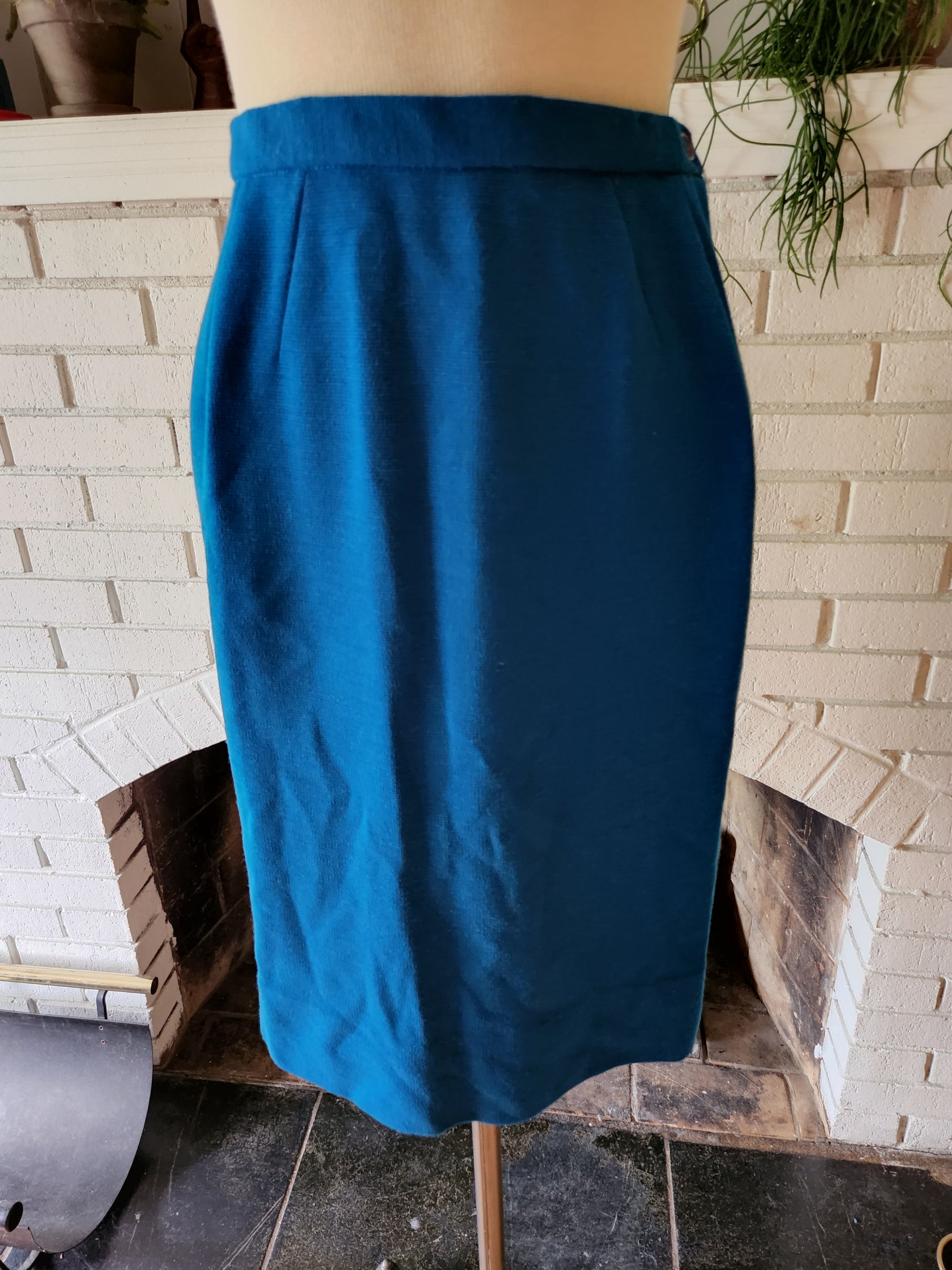 Here is a lovely little skirt. It feels like polyester or a blend. Rich teal blue color with subtle pleats around the waist. Buttoned back with a 7" zipper. Medium weight, slightly sheer, soft, and comfy. It's in amazing condition with tons of life left! The tag says Size 14, but here are the measurements taken laying flat (be sure to reference the last photo to see how I measure dresses)
