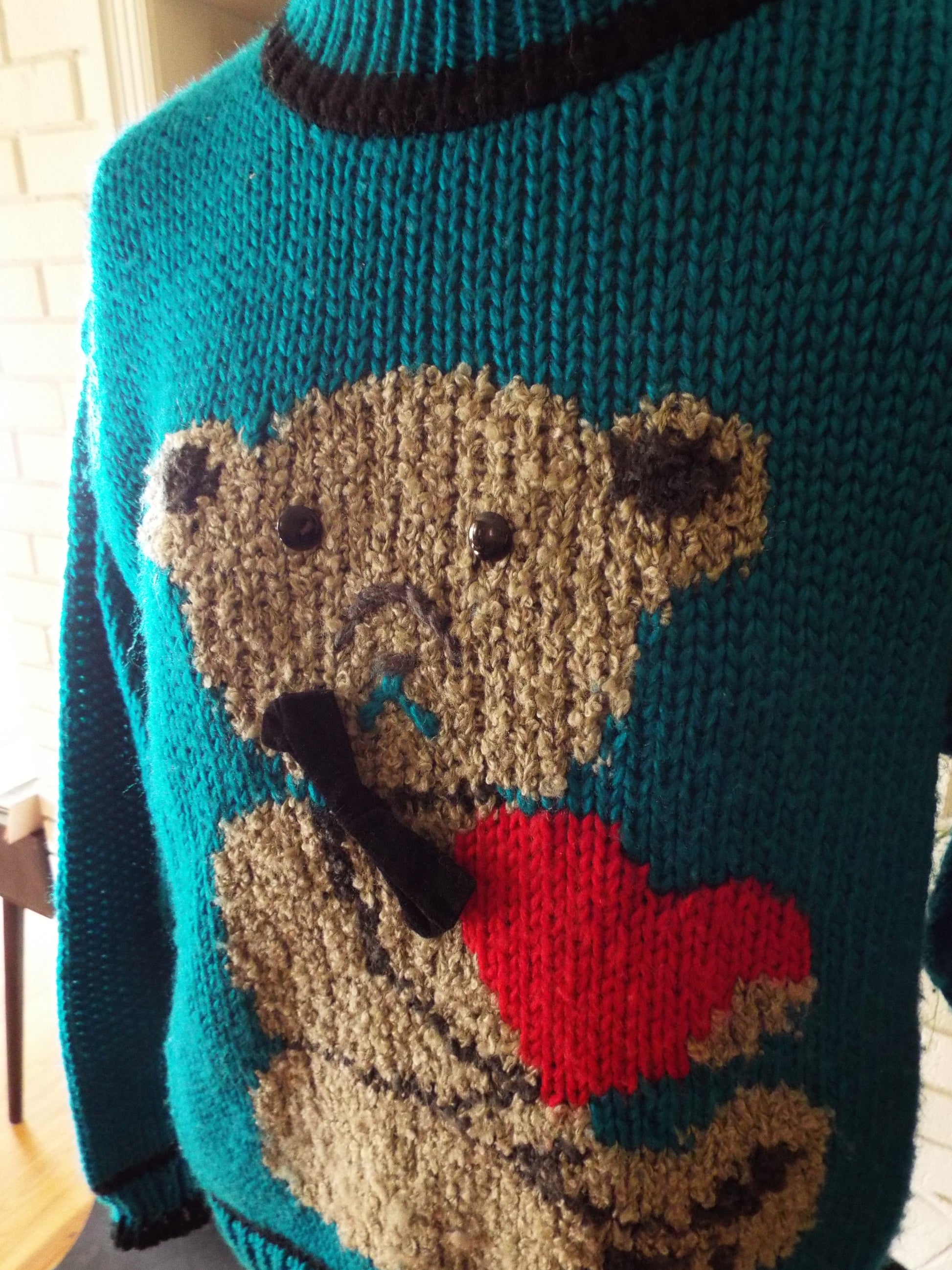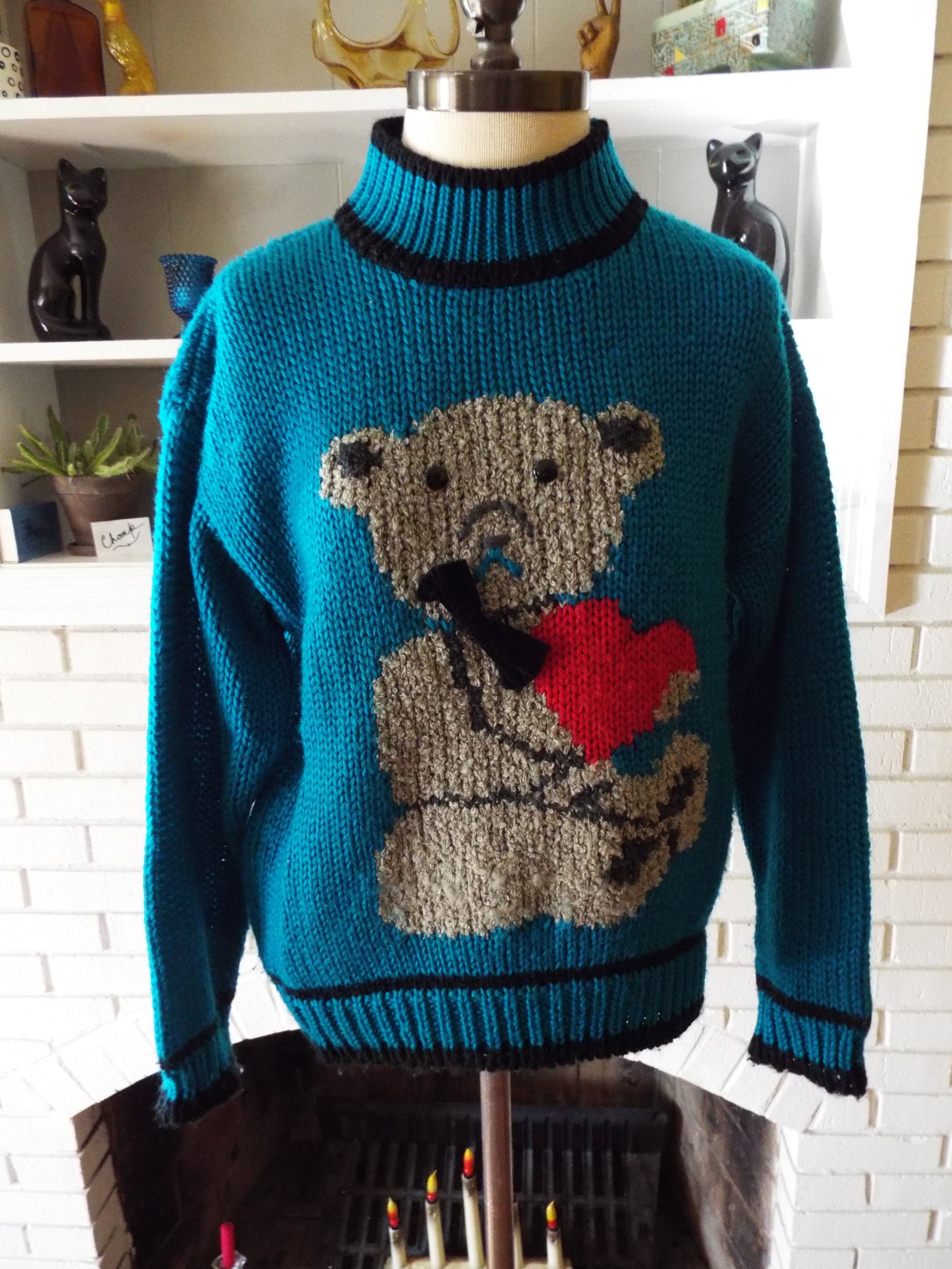 Here is an awesome vintage sweater by Evian II. It's 100% acrylic. Teal blue sweater with adorable teddy bear sewn in on the front, complete with button eyes and a little bow tie. Black accents at the cuffs, neck, and bottom. Fairly heavy weight, very warm and comfy. It's in amazing condition, and has years of life left. The tag says Medium, but here are the measurements taken laying flat. (refer to the last pic above to see how I measure shirts)
