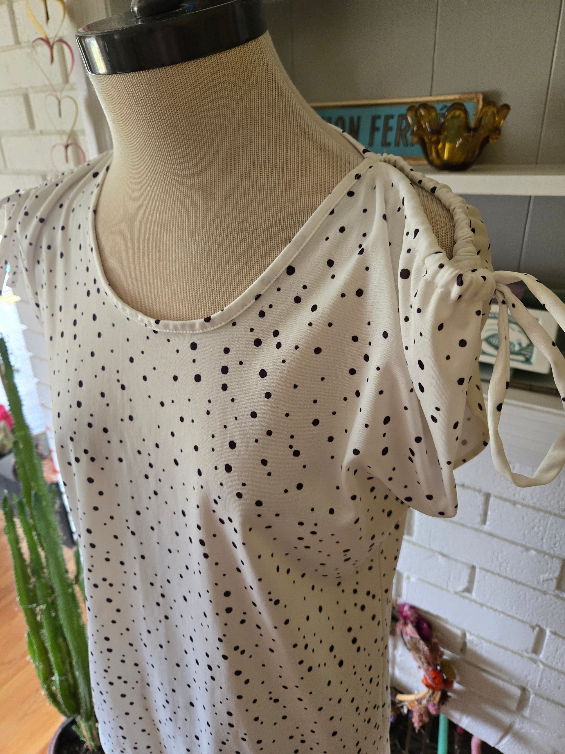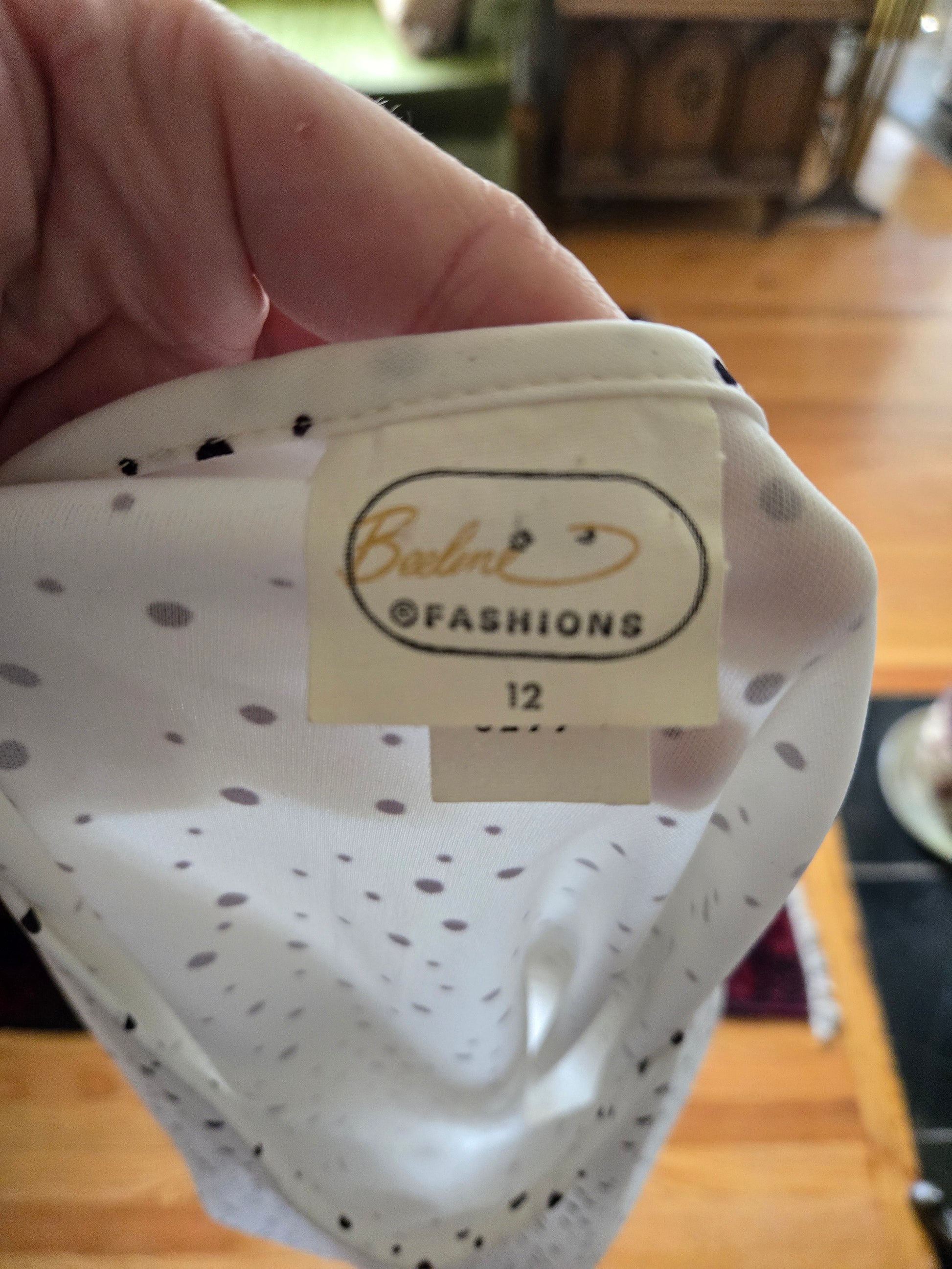 Here is an amazing skirt set from the 70s by Beeline. 100% polyester, and made in the USA. White fabric with black polka dots throughout. The top is sleeveless, with ties on the shoulders. The skirt has an elastic waist. Light weight fabric, sheer, soft and comfy. Both pieces are in amazing condition with tons of life left! The tag says Size 12, but here are the measurements when laying flat.
