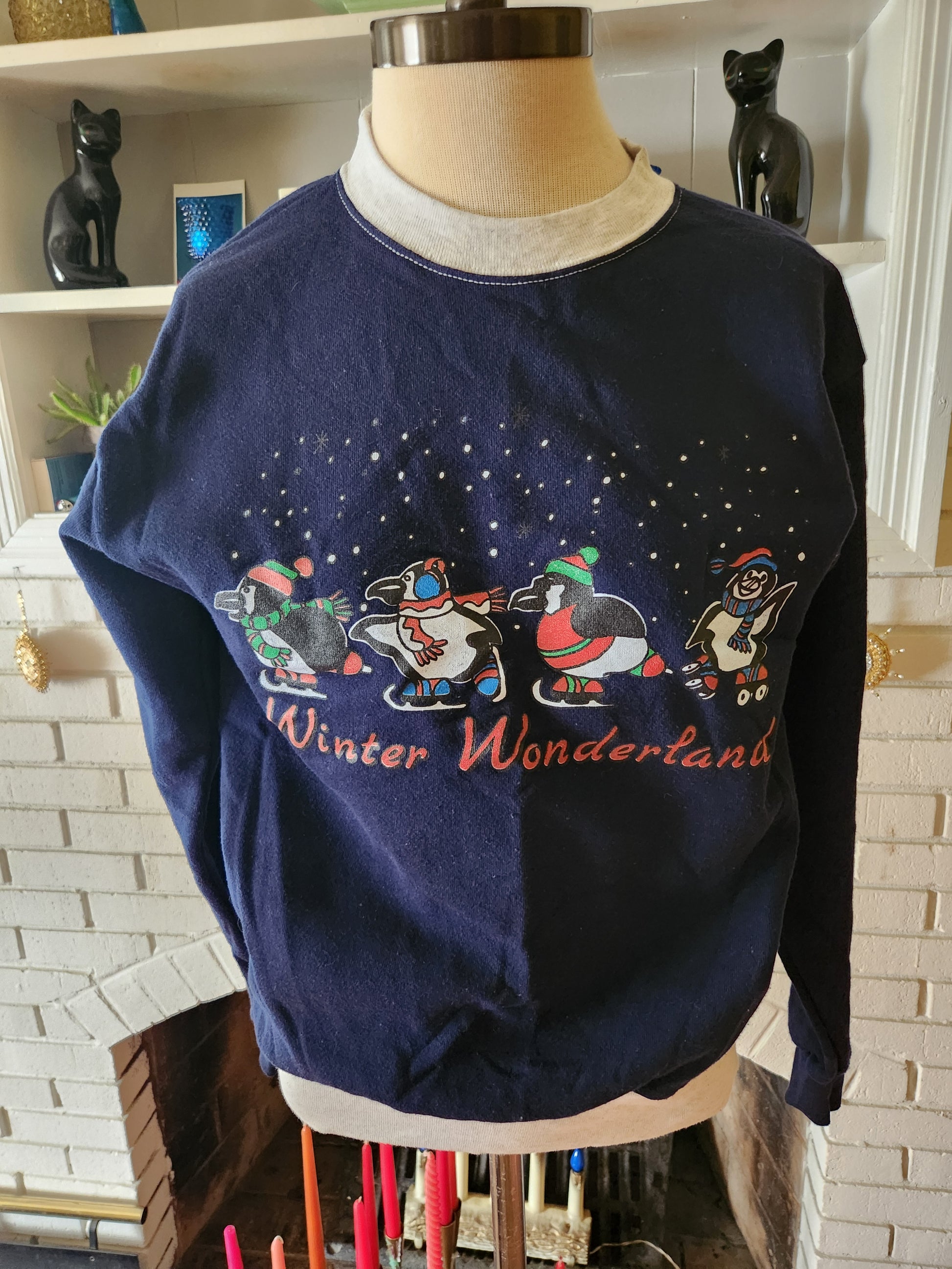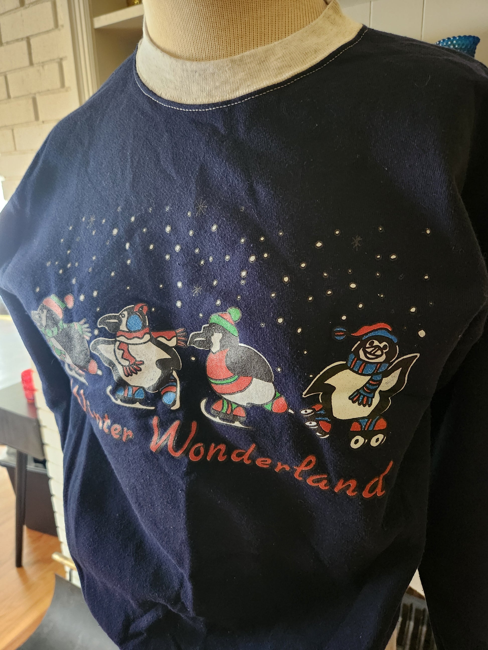 Here is a super cool sweatshirt, most likely from the mid 80s to early 90s. 50/50 blend of cotton and poly, and made in the USA. Dark blue shirt with gray accent and amazing graphic on the front. I love the little penguin on roller skates just going his own way. Medium weight, warm, soft and comfy. It's in amazing condition with tons of life left! The tag says Medium, but here are the measurements taken laying flat. (refer to the last pic above to see how I measure shirts)