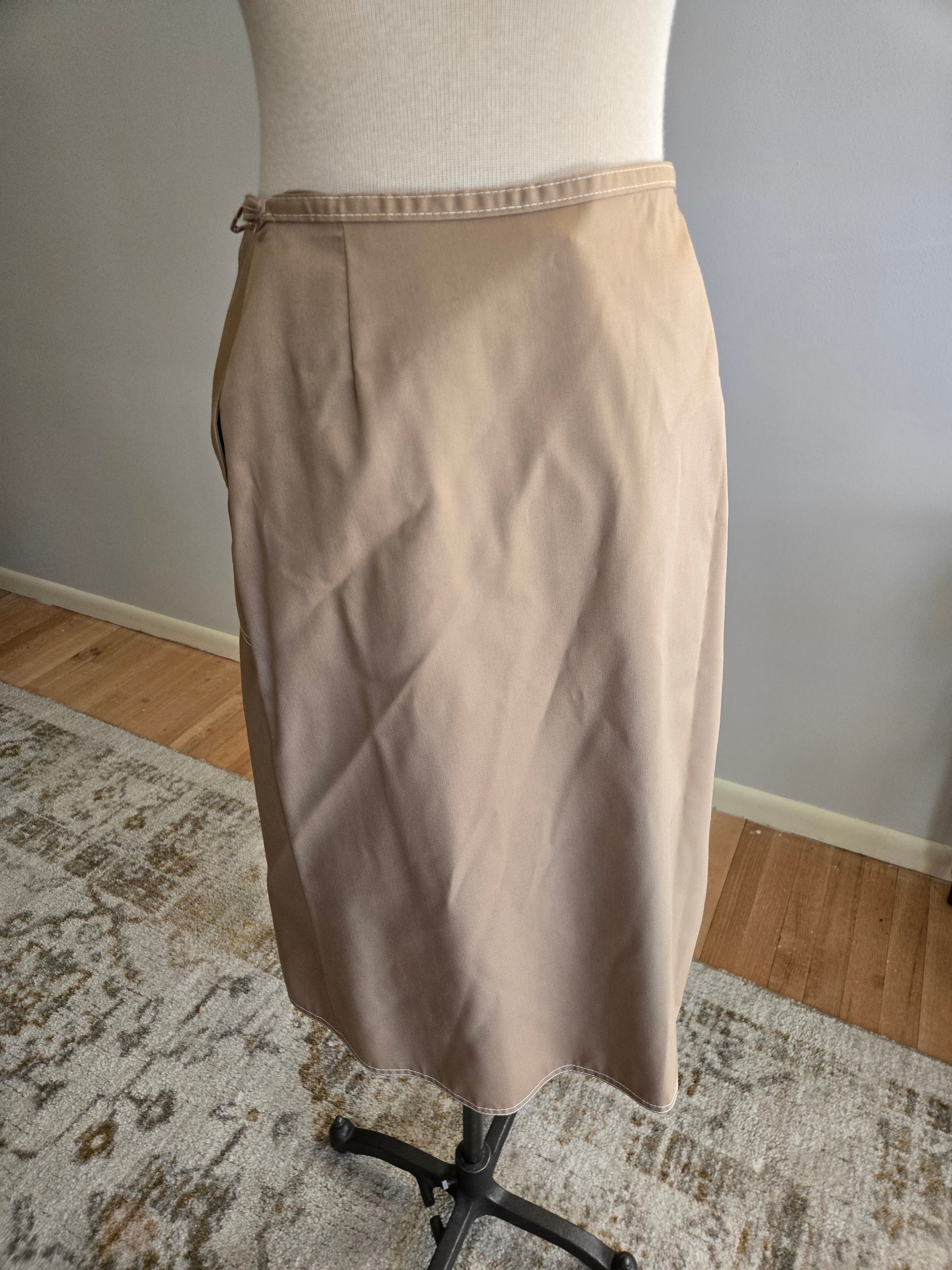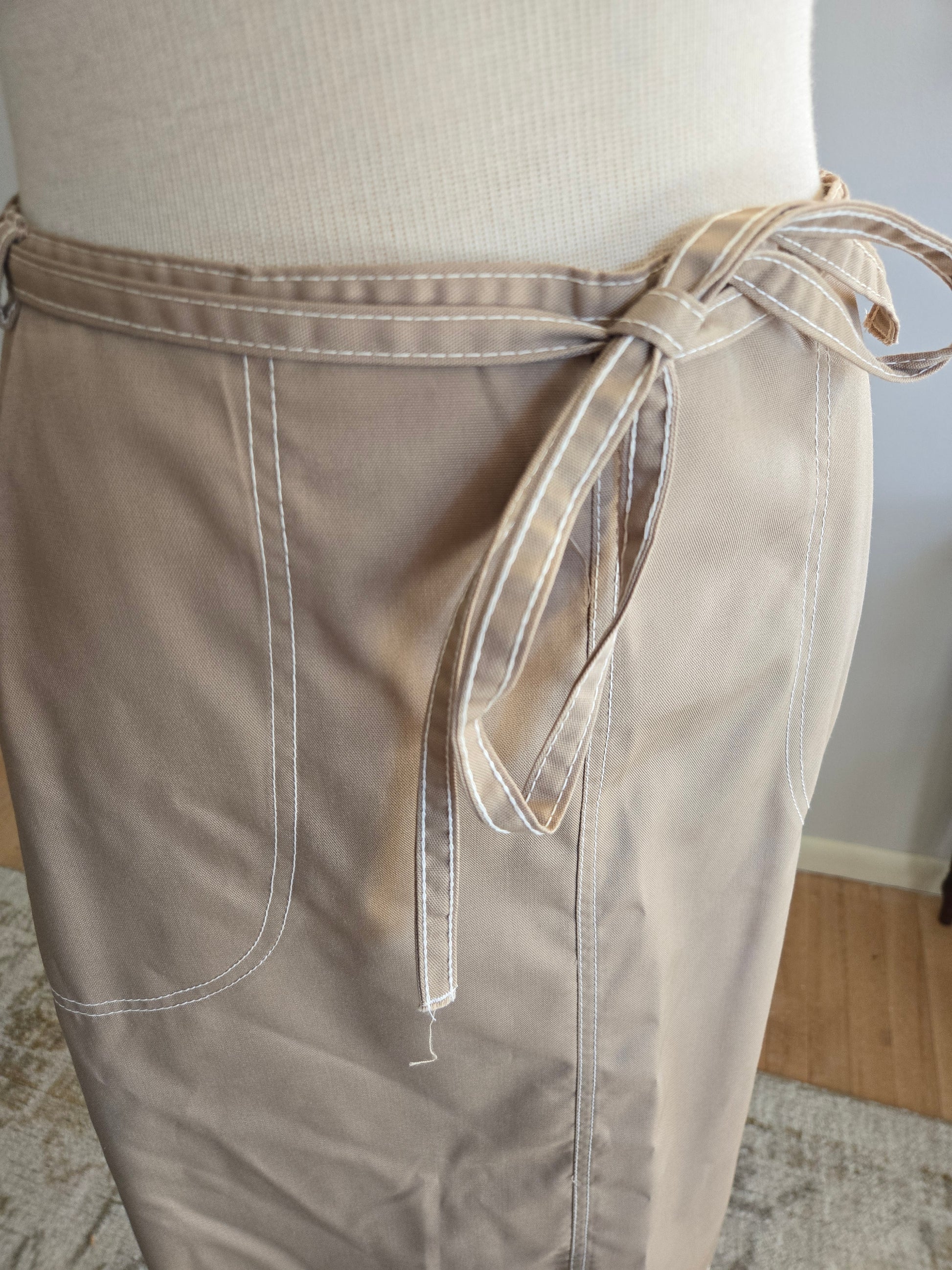 Here is an amazing wrap skirt from the 70s/80s by Briggs of New York. 65% polyester, 35% cotton. Tan fabric with crisp white stitching, built in tie, and a pocket on each hip. Medium weight, slightly sheer, and comfy. It's in excellent condition with years of life left! The tag says Size 16, but here are the measurements taken laying flat: