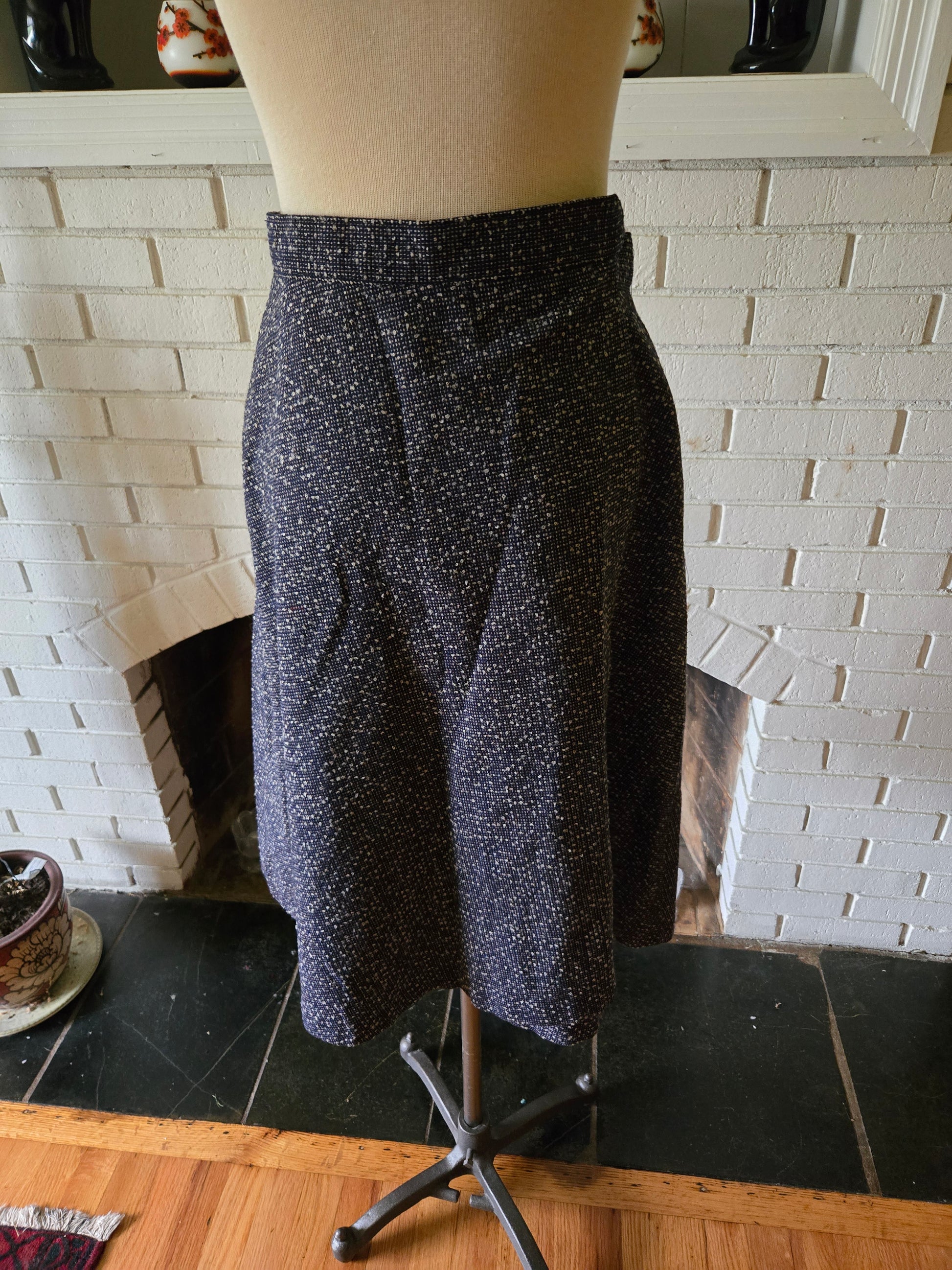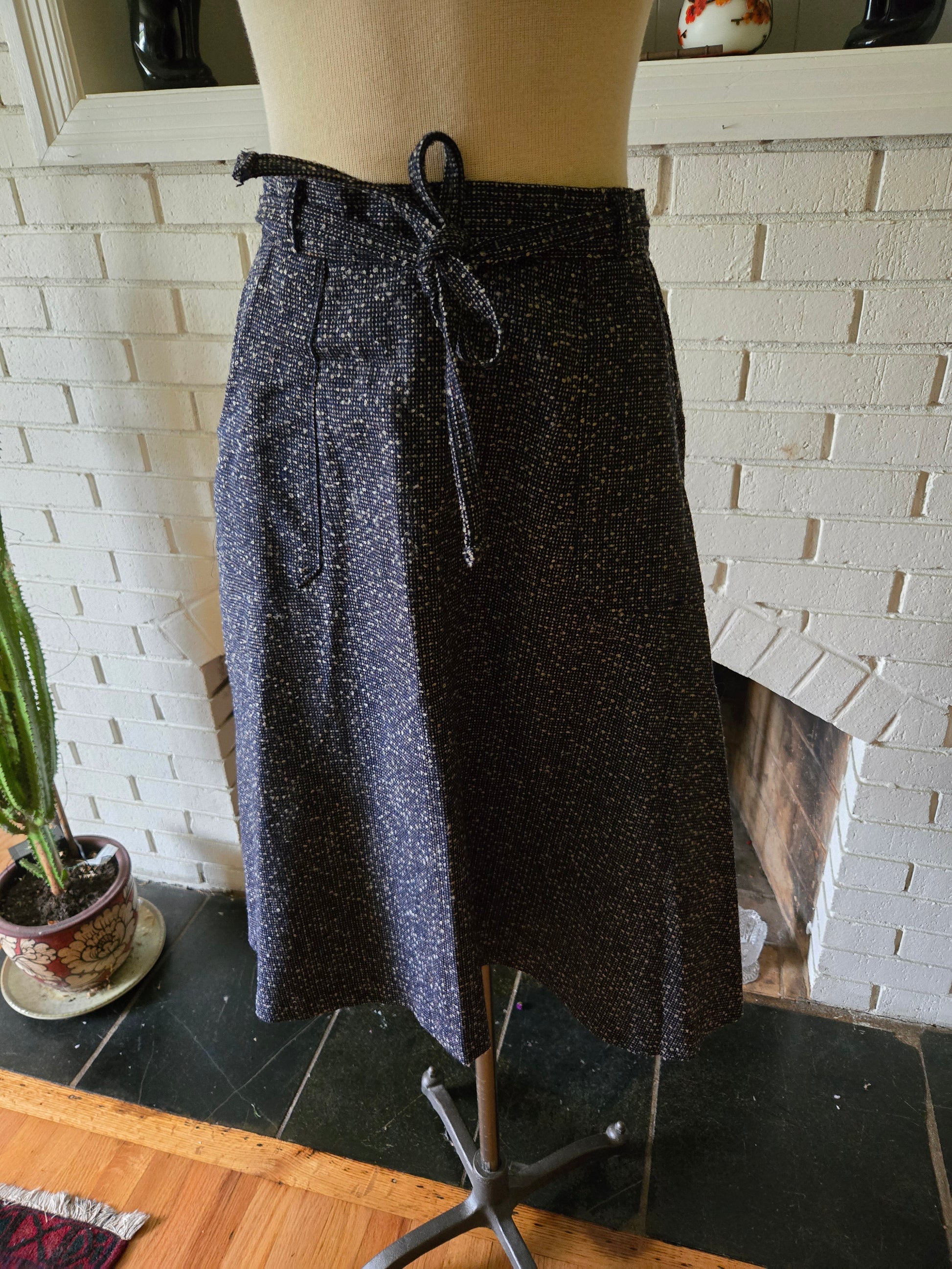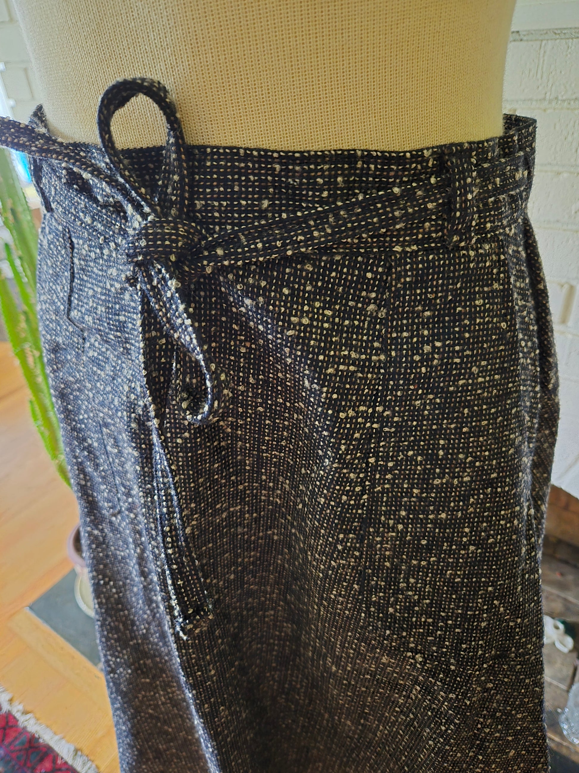 Here is a super sweet vintage wrap skirt by Chesapeake Bay Trading Co. Feels like mostly or all wool. Two pockets on the front. Built in tie/belt that loops through to the front. It's medium weight but comfy. It's in amazing condition with years of life left. Because of the nature of the wrap, it's kinda hard to nail down a waist size. It feels like 16" is where it sits the best, with the pockets lining up to the front while getting full coverage on the back...if that makes sense. Here are the measurements taken laying flat (be sure to check out the last photo to see how I measure dresses and skirts)